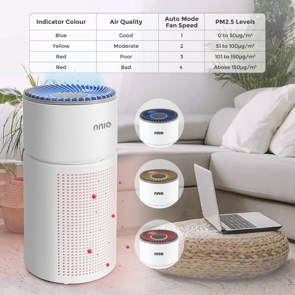 The built-in PM2.5 sensor continuously monitors air quality, displaying real-time levels of fine particles like dust and pollutants. The purifier automatically adjusts its speed to ensure the air you breathe stays clean and healthy