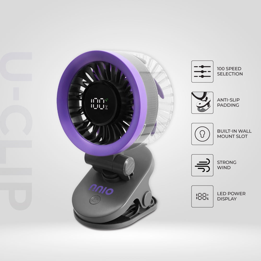 Stay cool anywhere with the U-CLIP High Speed Portable Fan. Clip, clamp or hang it with ease. Enjoy precise airflow with 100 speed levels, long-lasting battery life and fast USB-C charging. Anti-slip padding keeps it steady, while the LED display lets you check power levels at a glance.
